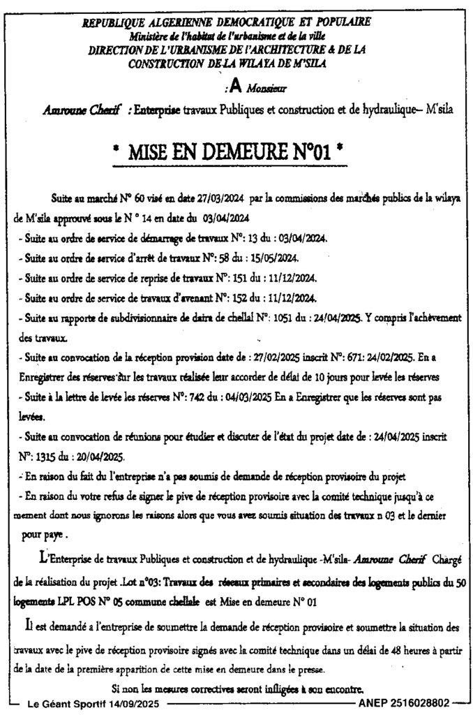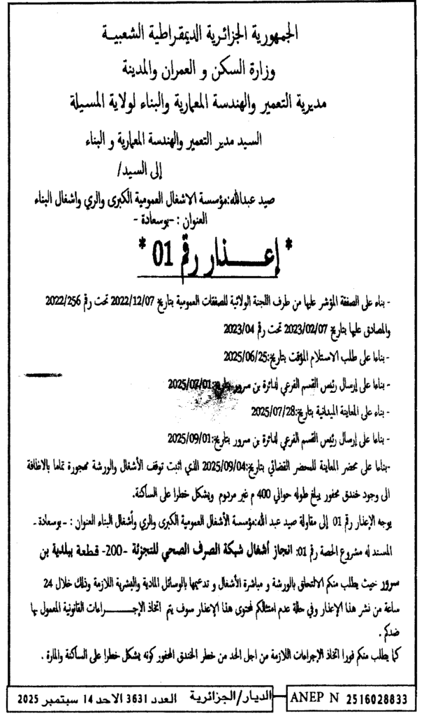 إعلان عن إعذار رقم 01 مديرية التعمير والهندسة المعمارية والبناء لولاية المسيلة