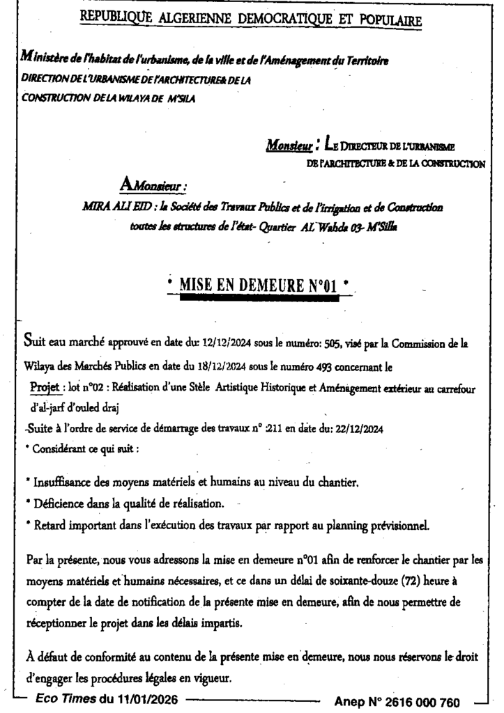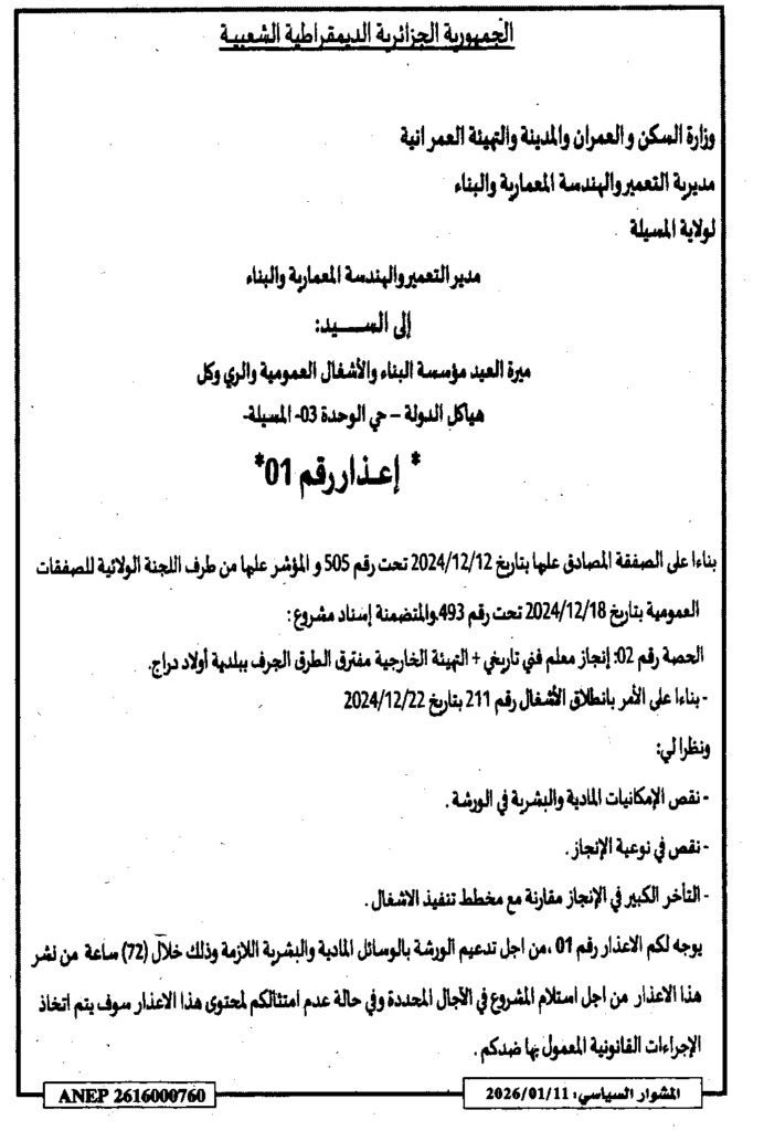 إعلان عن إعذار رقم 01 مديرية التعمير والهندسة المعمارية والبناء لولاية المسيلة