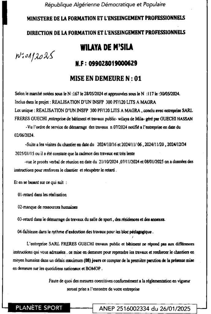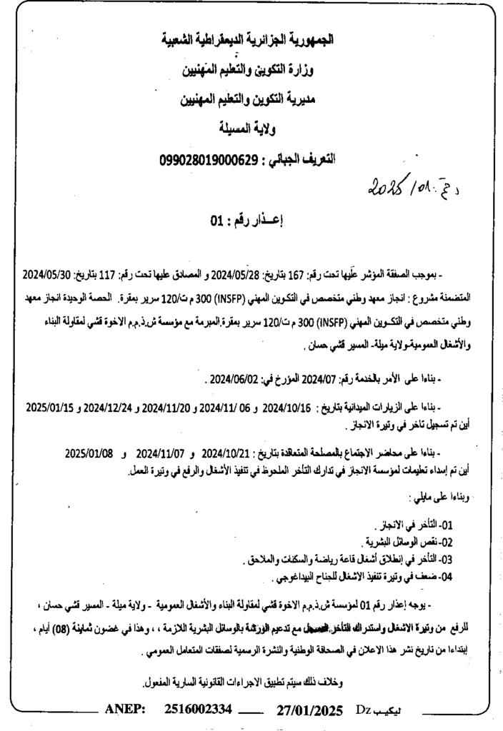 إعلان عن إعذار رقم 01/ مديرية التكوين والتعليم المهنيين لولاية المسيلة