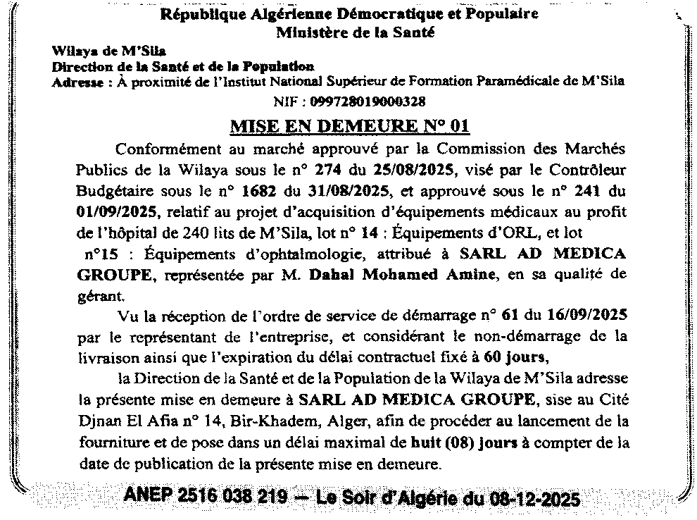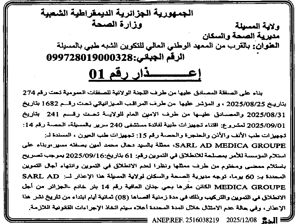 إعلان عن إعذار رقم 01 مديرية الصحة والسكان لولاية المسيلة