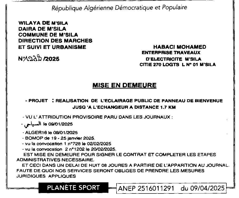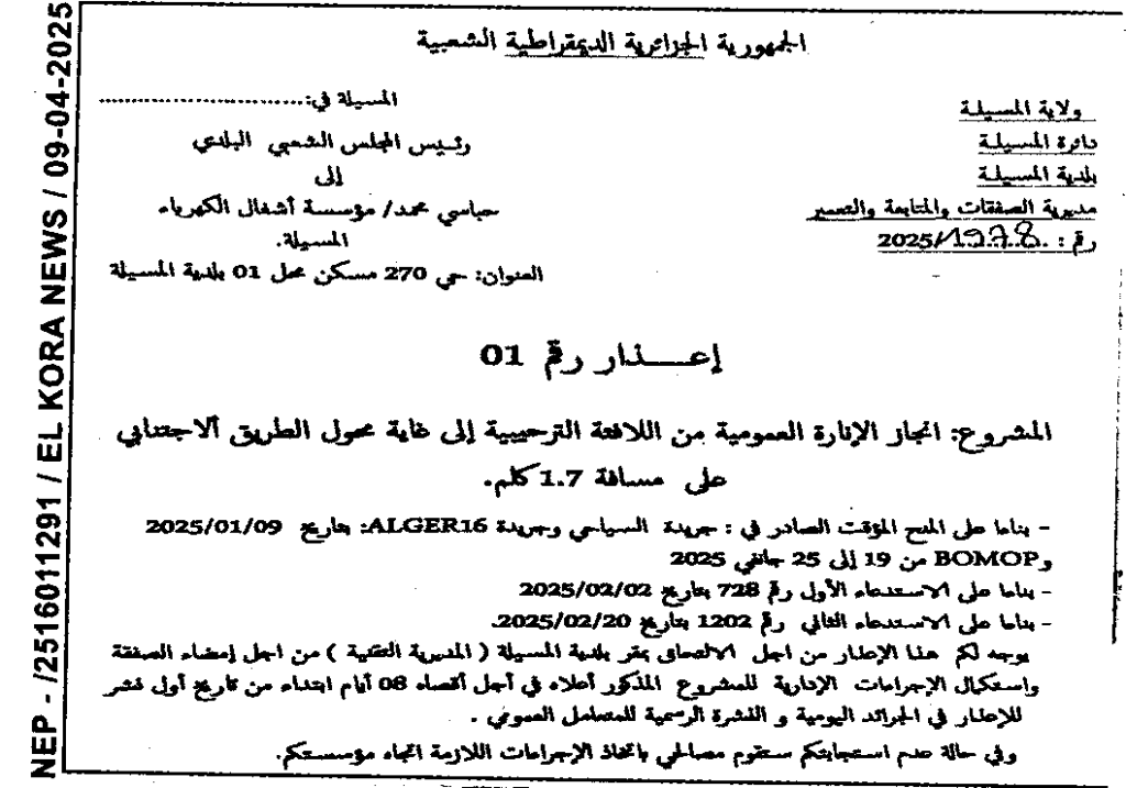 إعلان عن إعذار رقم 01 مديرية الصفقات والمتابعة والتعمير بلدية المسيلة