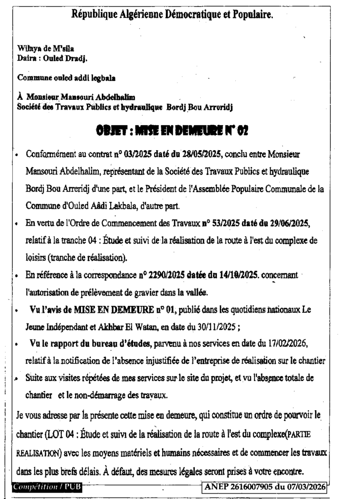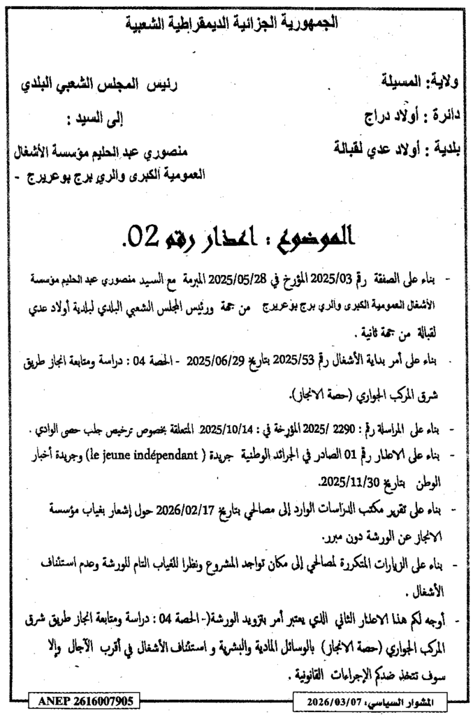 إعلان عن إعذار رقم 02 بلدية أولاد عدي لقبالة