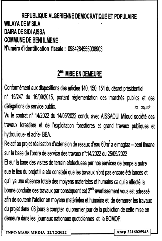 إعلان عن إعذار رقم 02 بلدية بني يلمان