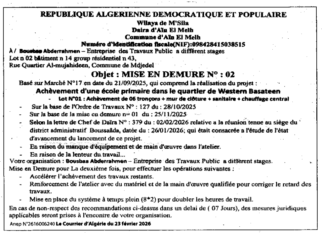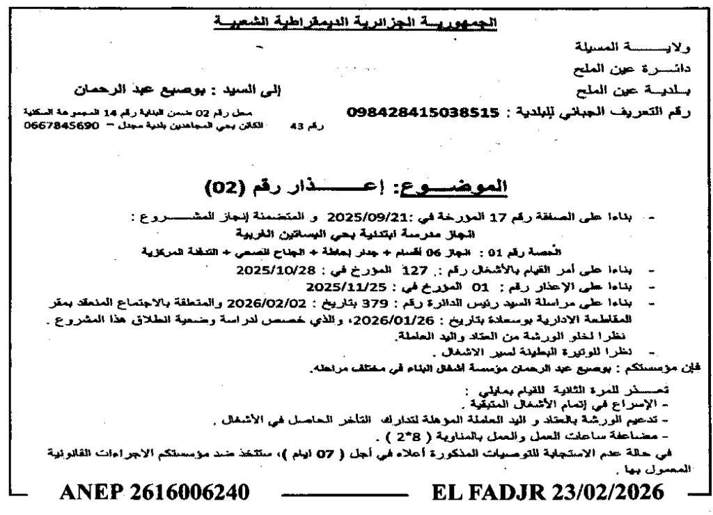 إعلان عن إعذار رقم 02/ بلدية عين الملح