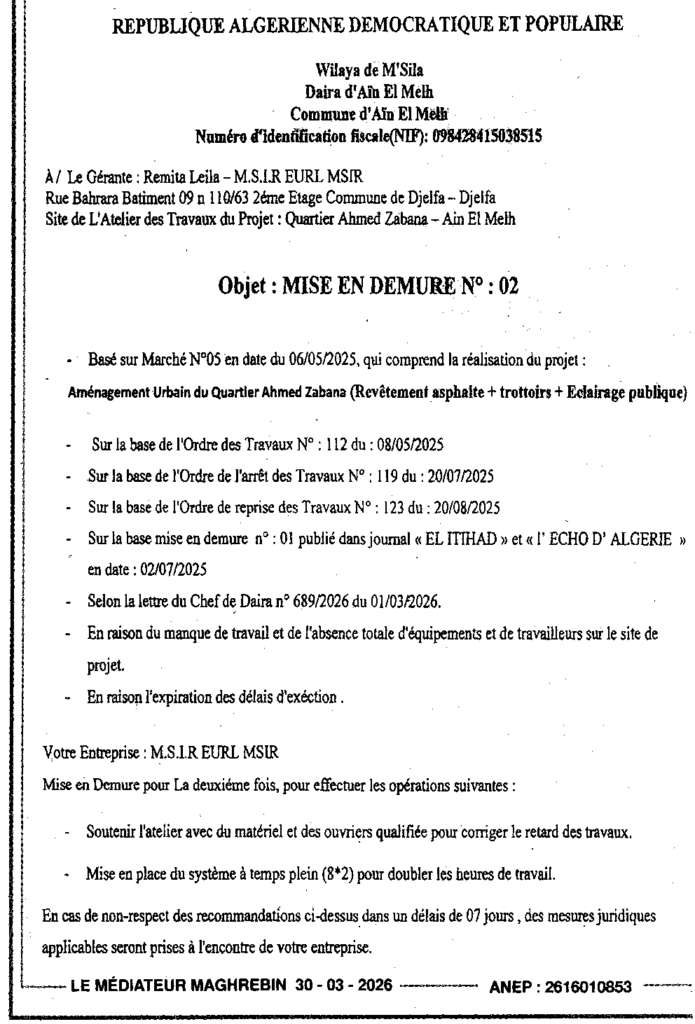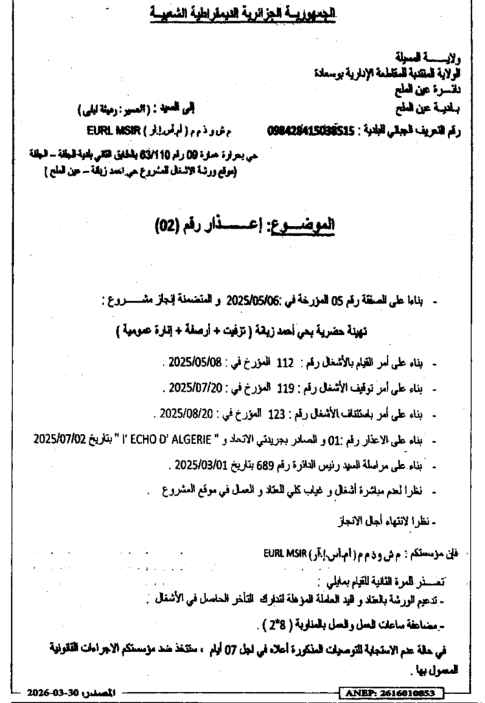 إعلان عن إعذار رقم 02 تهيئة حضرية بحي أحمد زبانة/ بلدية عين الملح