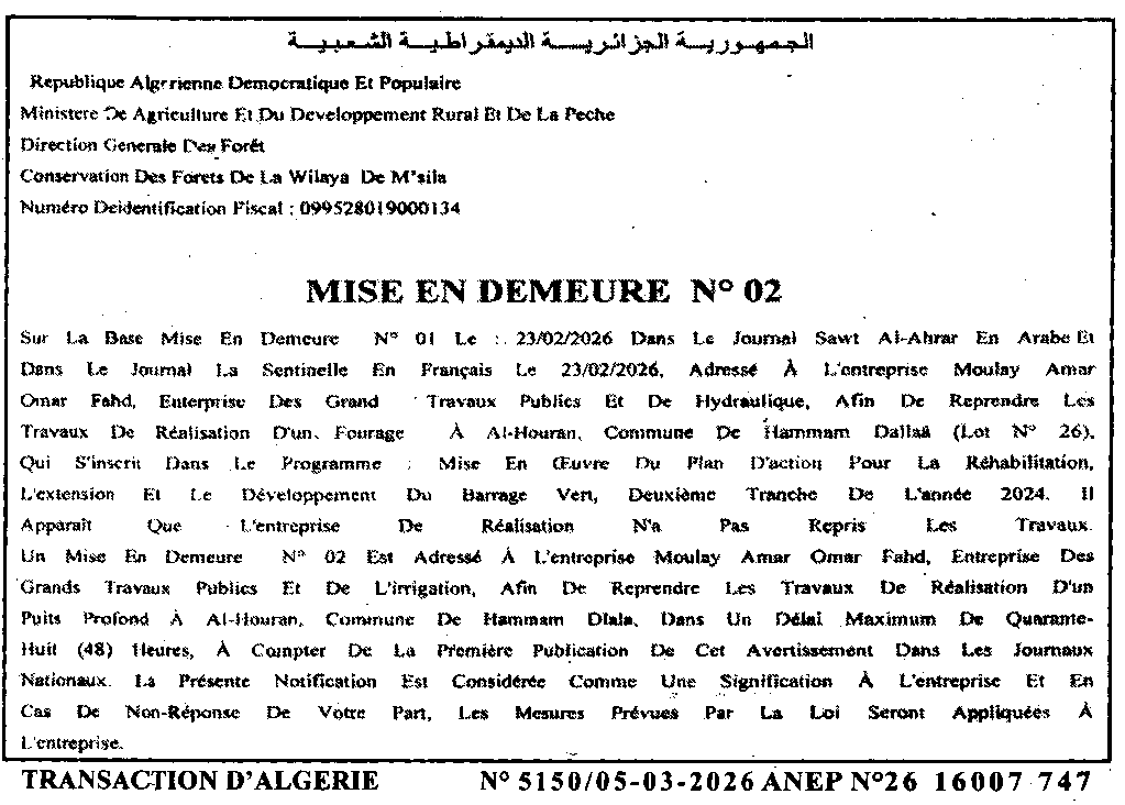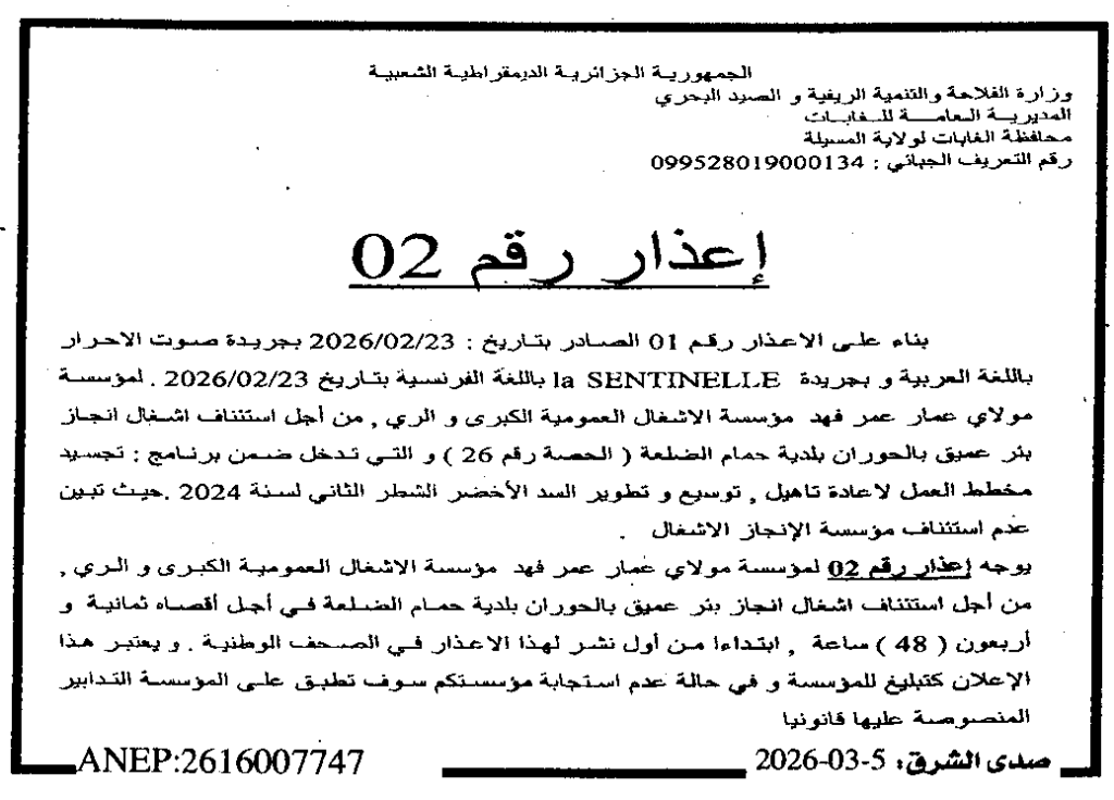 إعلان عن إعذار رقم 02/ محافظة الغابات لولاية المسيلة