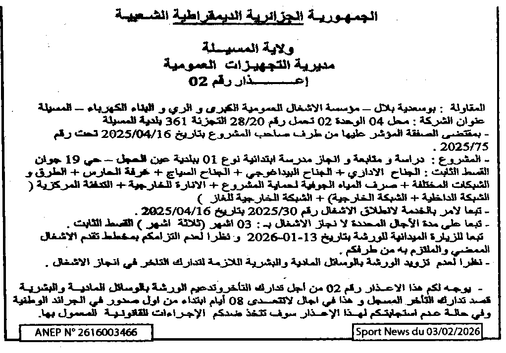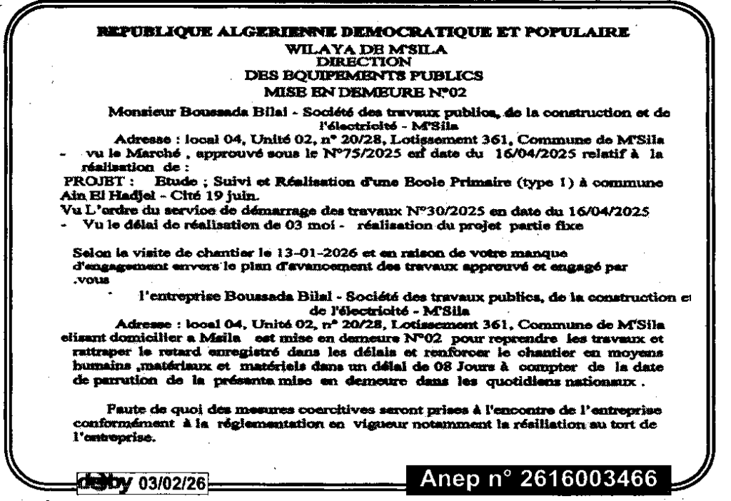 إعلان عن إعذار رقم 02/ مديرية التجهيزات العمومية لولاية المسيلة
