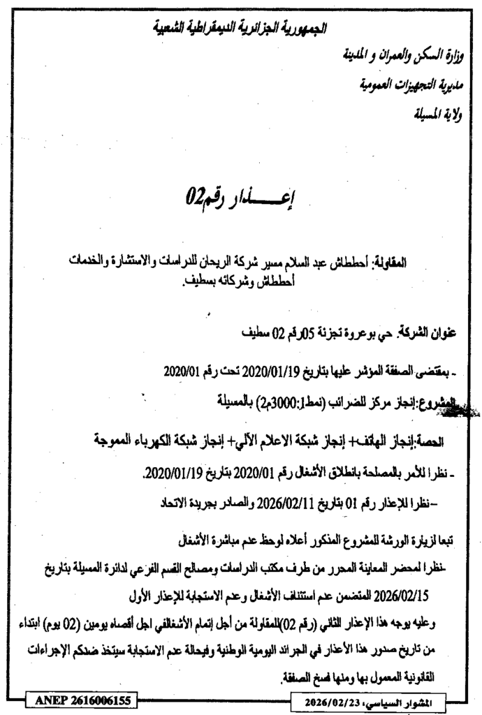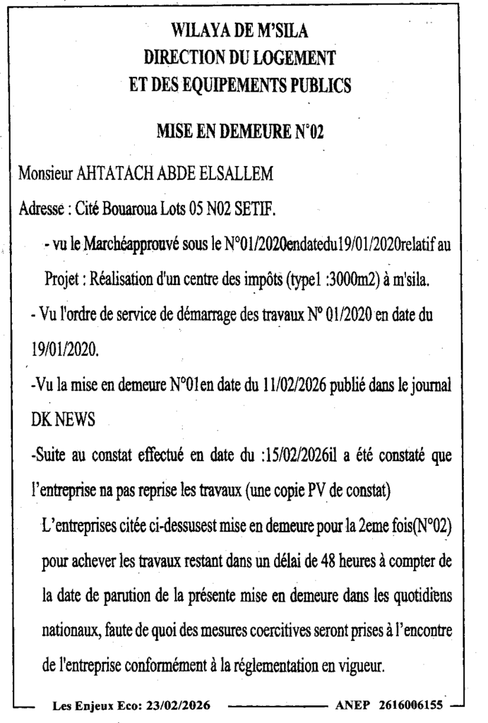 إعلان عن إعذار رقم 02/ مديرية التجهيزات العمومية لولاية المسيلة
