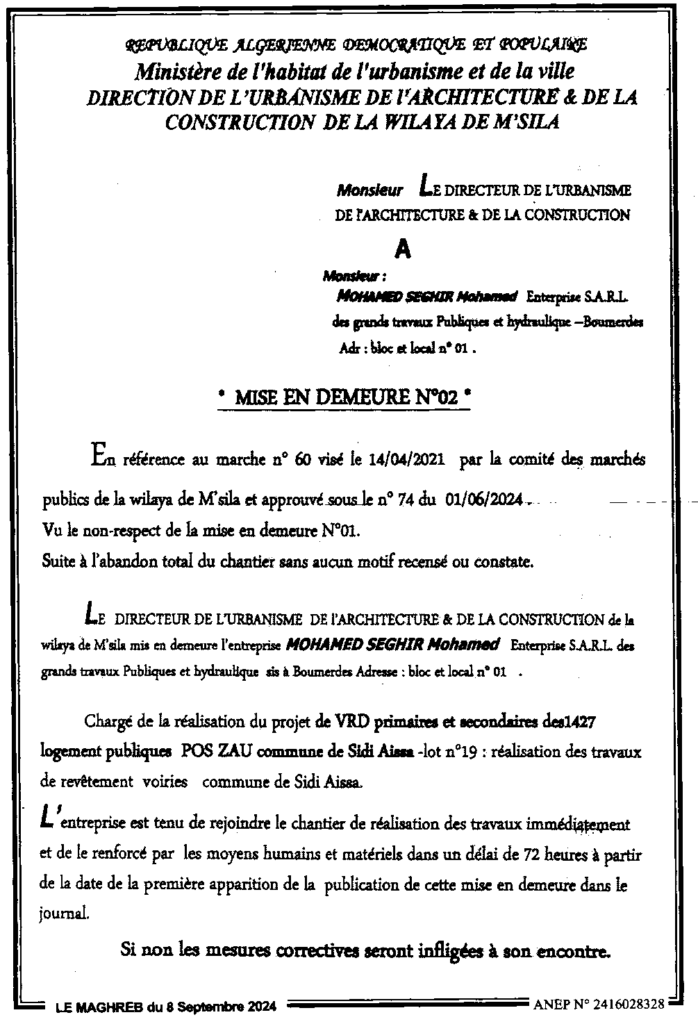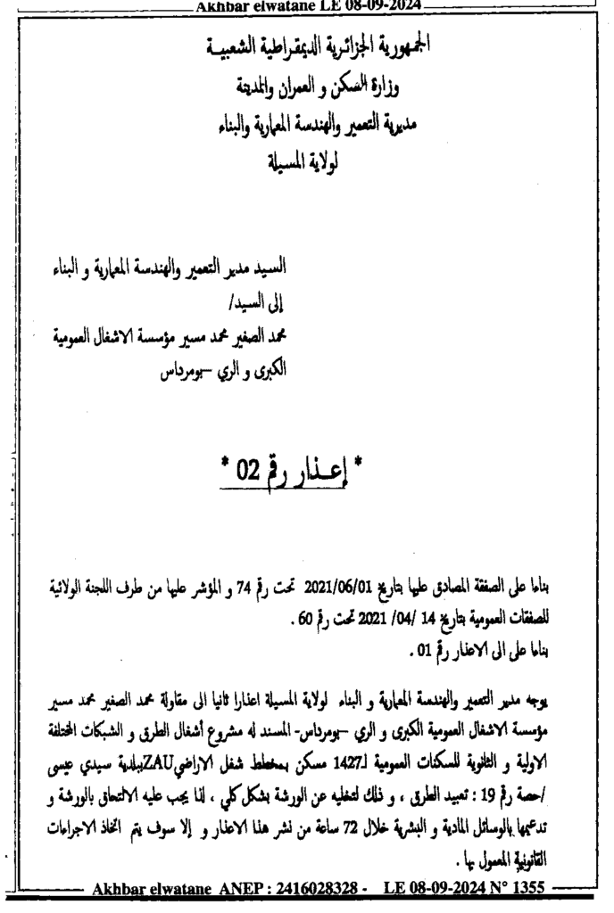 إعلان عن إعذار رقم 02 مديرية التعمير والهندسة المعمارية والبناء لولاية المسيلة