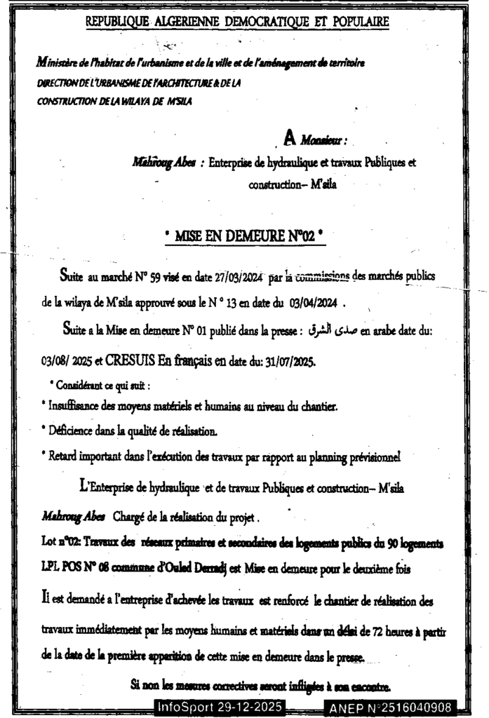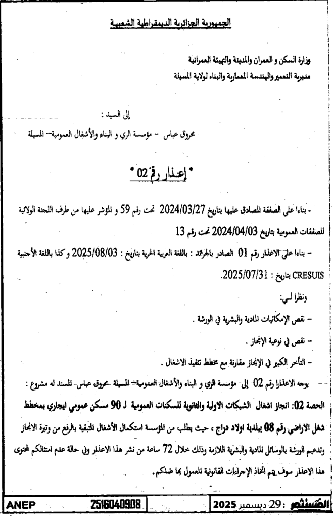 إعلان عن إعذار رقم 02/ مديرية التعمير والهندسة المعمارية والبناء لولاية المسيلة