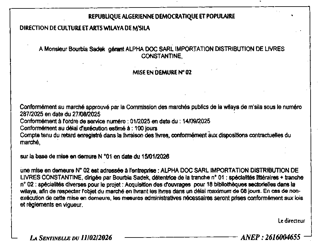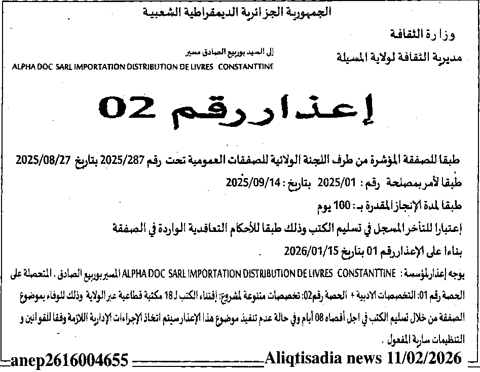 إعلان عن إعذار رقم 02 مديرية الثقافة لولاية المسيلة