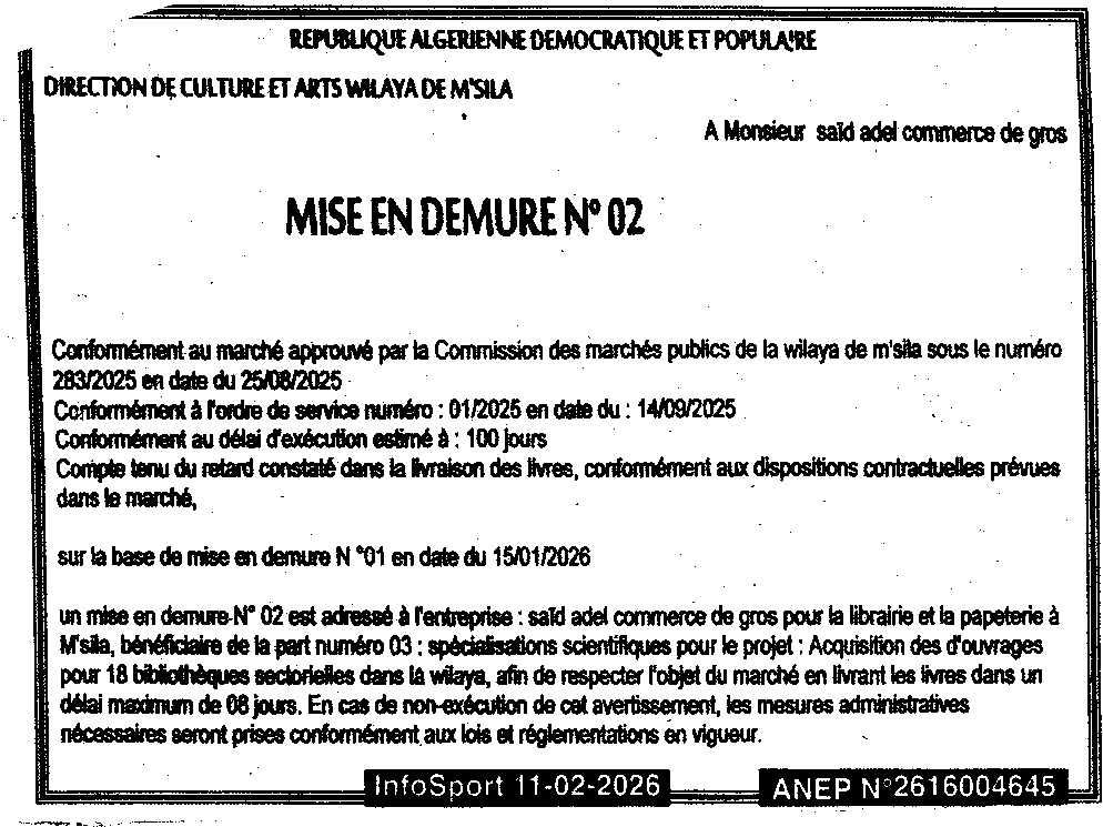 إعلان عن إعذار رقم 02 مديرية الثقافة لولاية المسيلة
