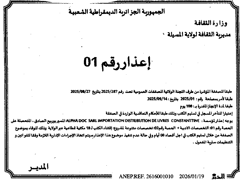 إعلان عن إعذار رقم 02 مديرية الثقافة لولاية المسيلة