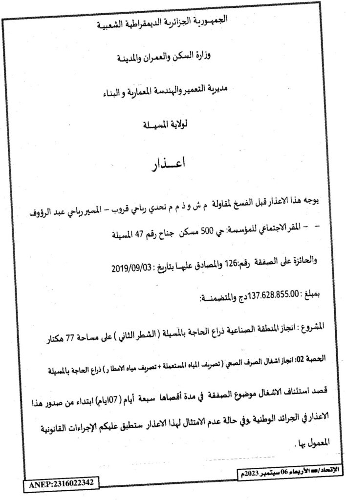 إعلان عن إعذار/ مديرية التعمير والهندسة المعمارية والبناء لولاية المسيلة