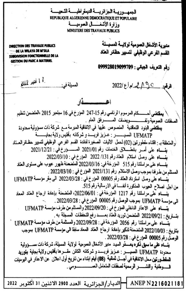 إعلان عن إعــذار القسم الفرعي الوظيفي لتسيير حظائر العتاد