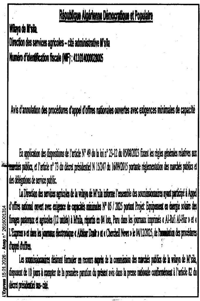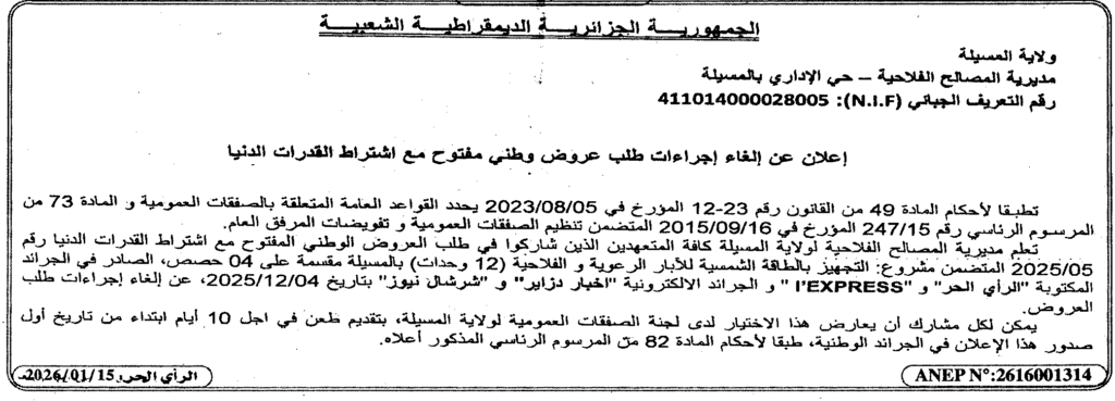 إعلان عن إلغاء إجراءات طلب عروض وطني مفتوح/ مديرية المصالح الفلاحية لولاية المسيلة