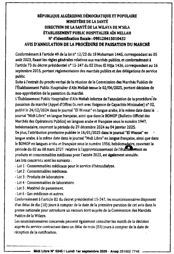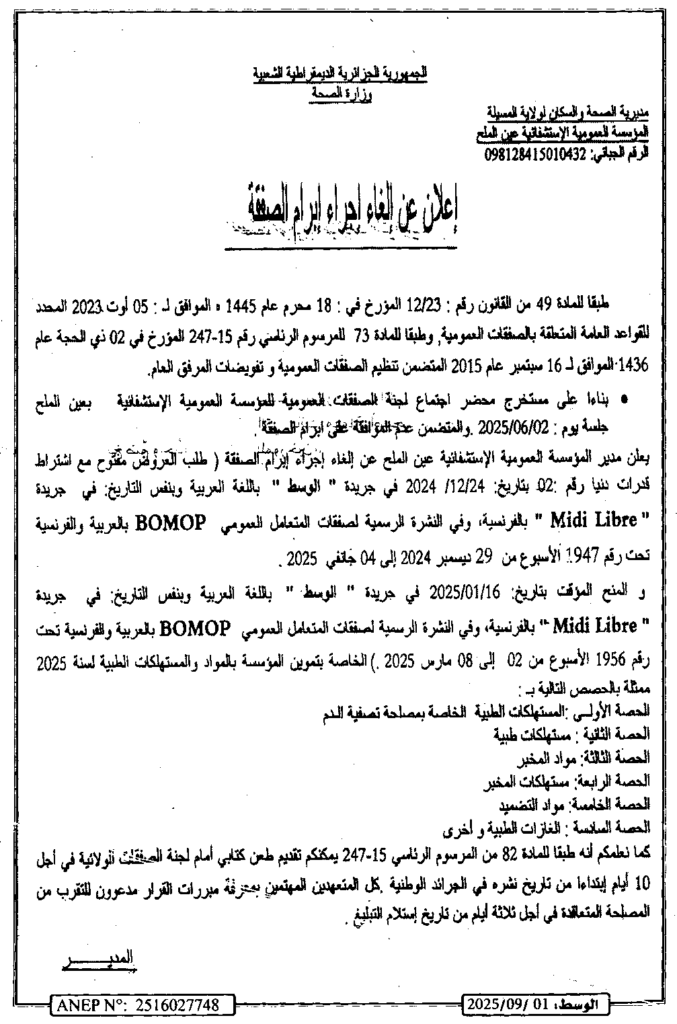 إعلان عن إلغاء إجراء إبرام الصفقة تموين المؤسسة بالمواد والمستهلكات الطبية لسنة 2025/ المؤسسة العمموية الاستشفائية عين الملح