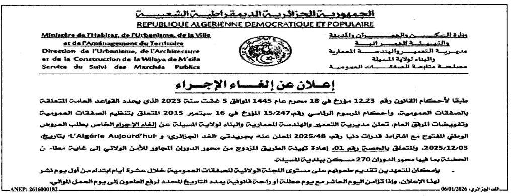 إعلان عن إلغاء الإجراء إعادة تهيئة الطريق المزدوج/ مديرية التعمير والهندسة المعمارية والبناء لولاية المسيلة