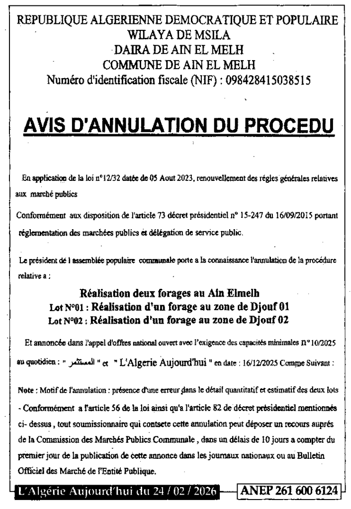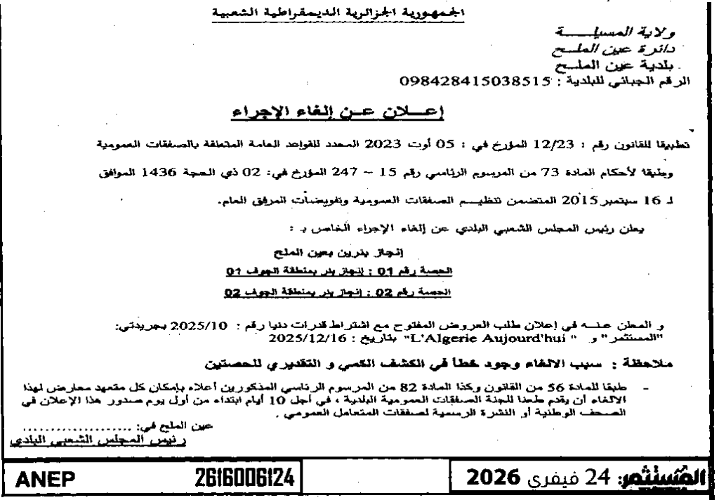 إعلان عن إلغاء الإجراء/ بلدية عين الملح