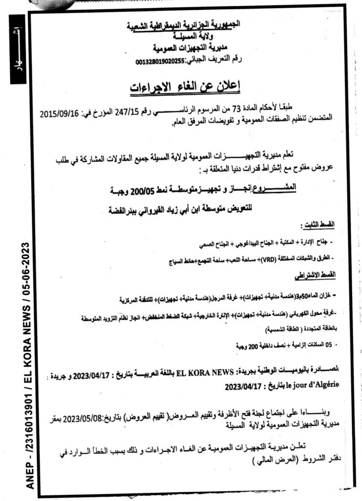 إعلان عن إلغاء الاجراءات: إنجاز وتجهيز متوسطة نمط 200/05 وجبة مديرية التجهيزات العمومية لولاية المسيلة
