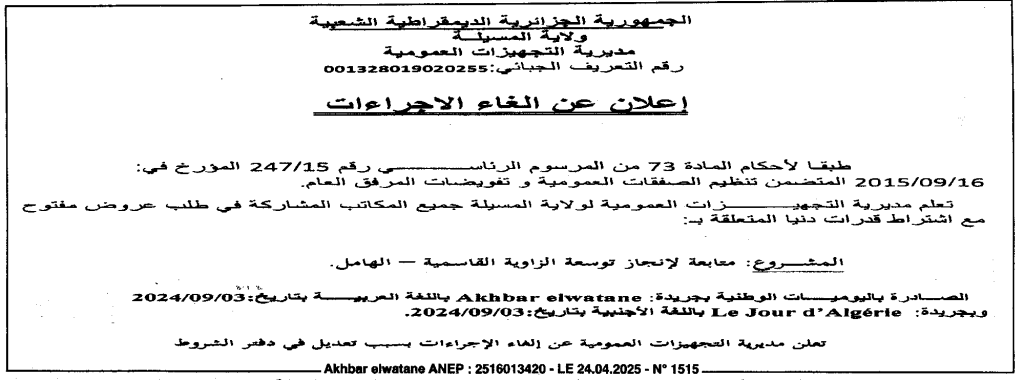 إعلان عن إلغاء الاجراءات المشروع متابعة لانجاز توسعة الزاوية القاسمية/ مديرية التجهيزات العمومية لولاية المسيلة