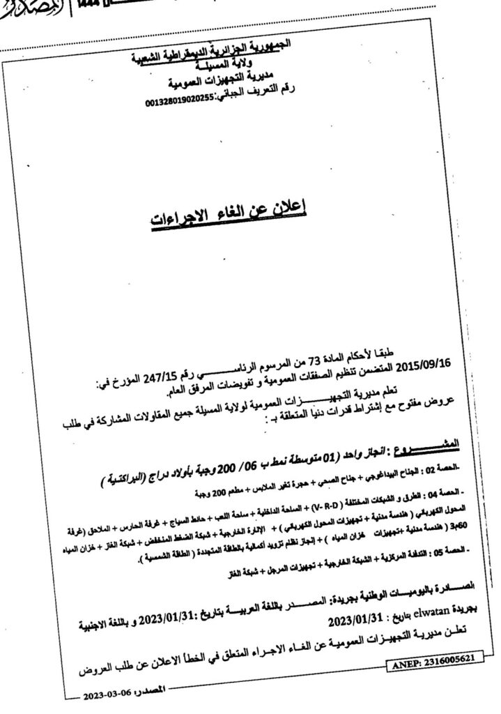 إعلان عن إلغاء الاجراءات/ مديرية التجهيزات العمومية لولاية المسيلة
