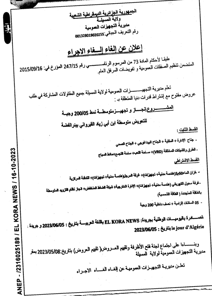 إعلان عن إلغاء الاجراء: انجاز وتجهيز متوسطة نمط 05/200 وجبة للتعويض متوسطة ابن ابي زياد القيرواني ببئر الفضة/ مديرية التجهيزات العمومية