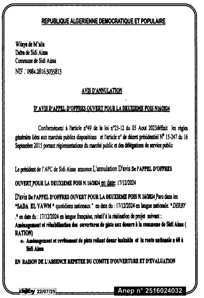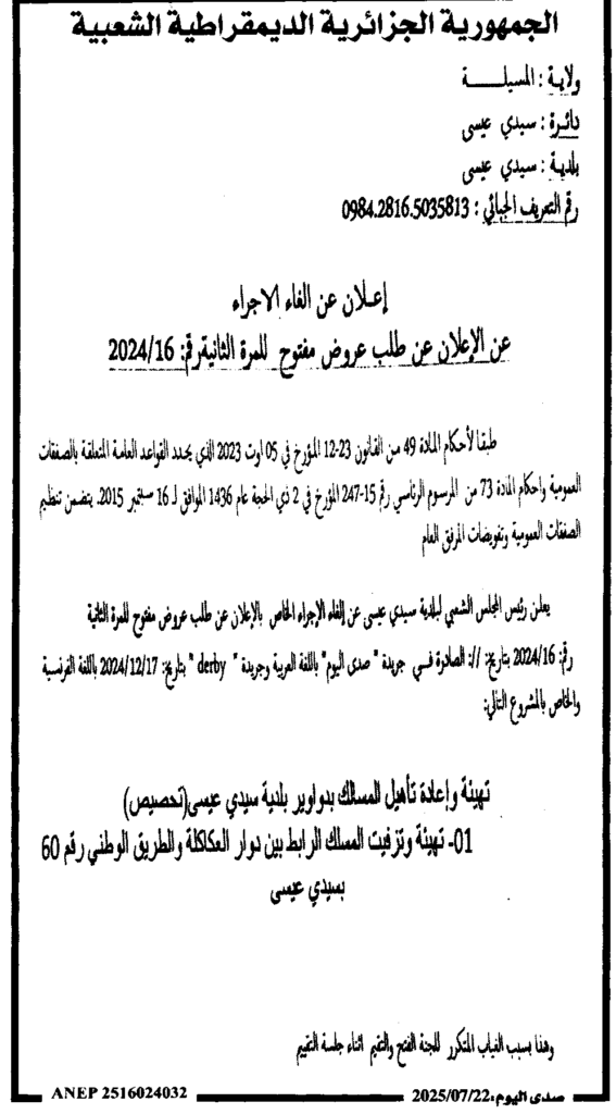 إعلان عن إلغاء الاجراء عن الإعلان عن طلب عروض مفتوح للمرة الثانية 2024/16 بلدية سيدي عيسى
