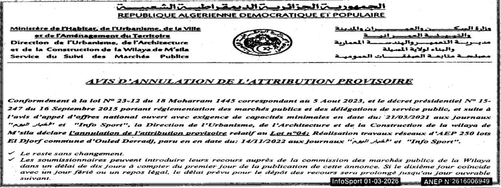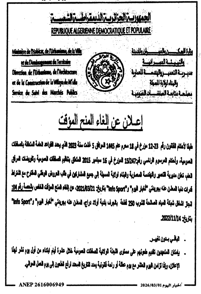 إعلان عن إلغاء المنح المؤقت انجاز أشغال شبكة المياه الصالحة للشرب/ مديرية التعمير والهندسة المعمارية والبناء لولاية المسيلة