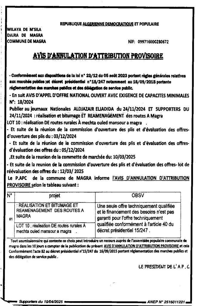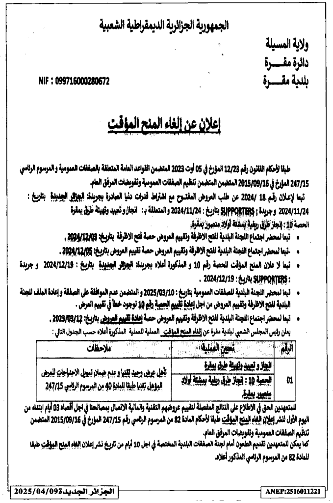 إعلان عن إلغاء المنح المؤقت انجاز وتعبيد وتهيئة طرق بمقرة/ بلدية مقرة