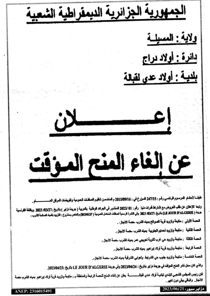 إعلان عن إلغاء المنح المؤقت/ بلدية أولاد عدي لقبالة