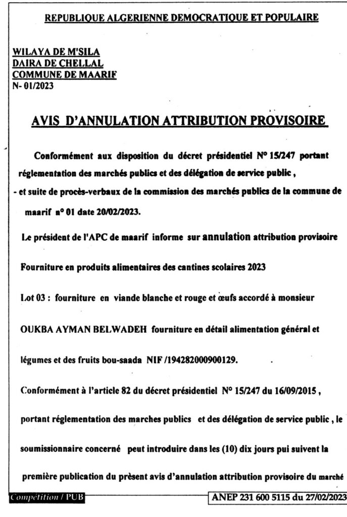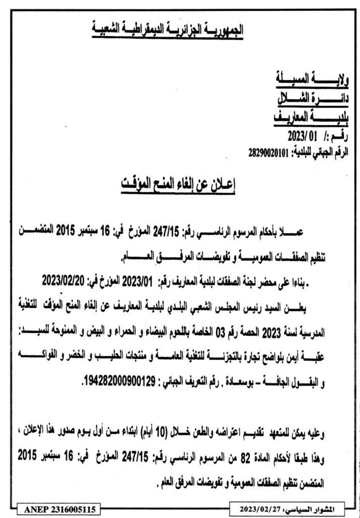 إعلان عن إلغاء المنح المؤقت/ بلدية المعاريف