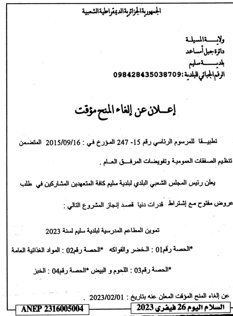 إعلان عن إلغاء المنح المؤقت/ بلدية سليم