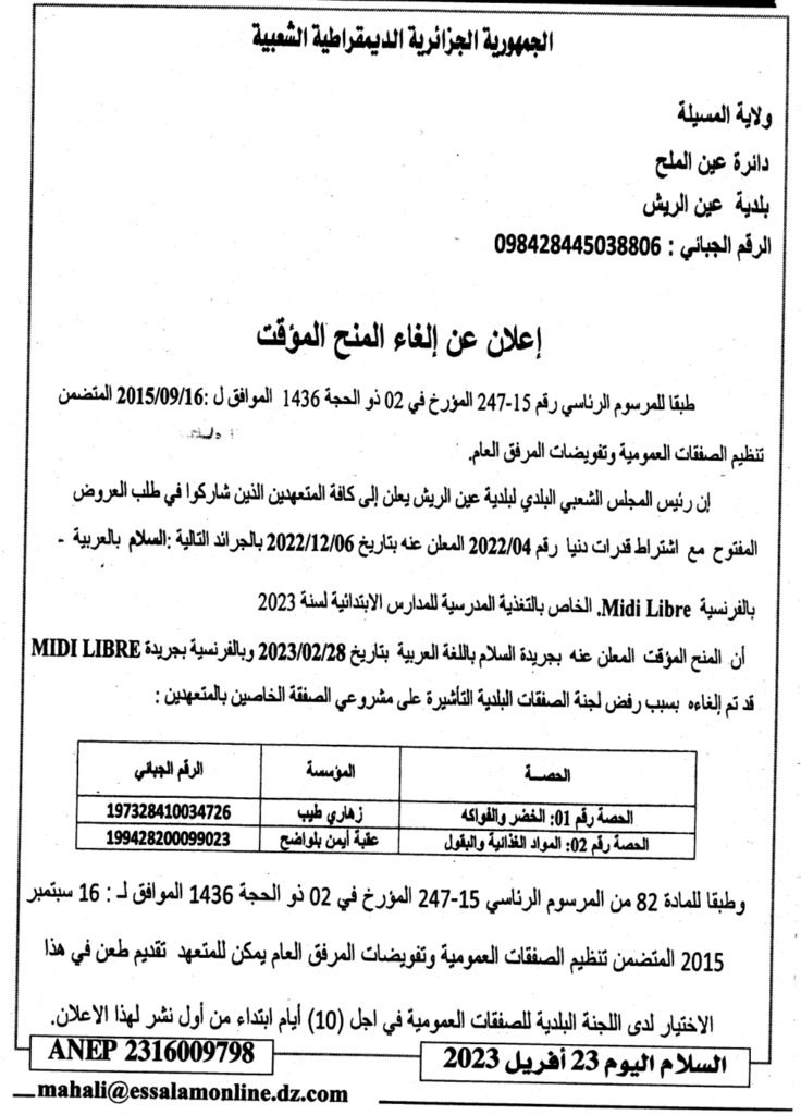 إعلان عن إلغاء المنح المؤقت/ بلدية عين الريش