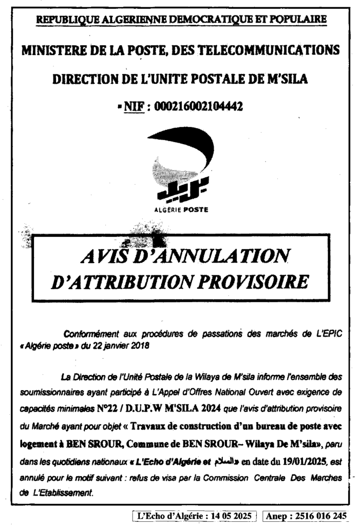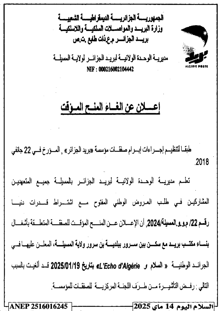 إعلان عن إلغاء المنح المؤقت بناء مكتب بريد مع سكن ببن سرور/ مديرية الوحدة الولائية لبريد الجزائر لولاية المسيلة