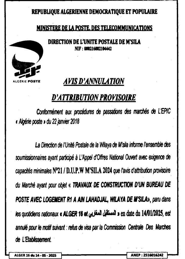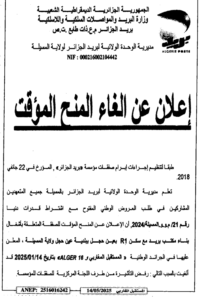 إعلان عن إلغاء المنح المؤقت بناء مكتب بريد مع سكن R1 بعين الحجل/ مديرية الوحدة الولائية لبريد الجزائر لولاية المسيلة