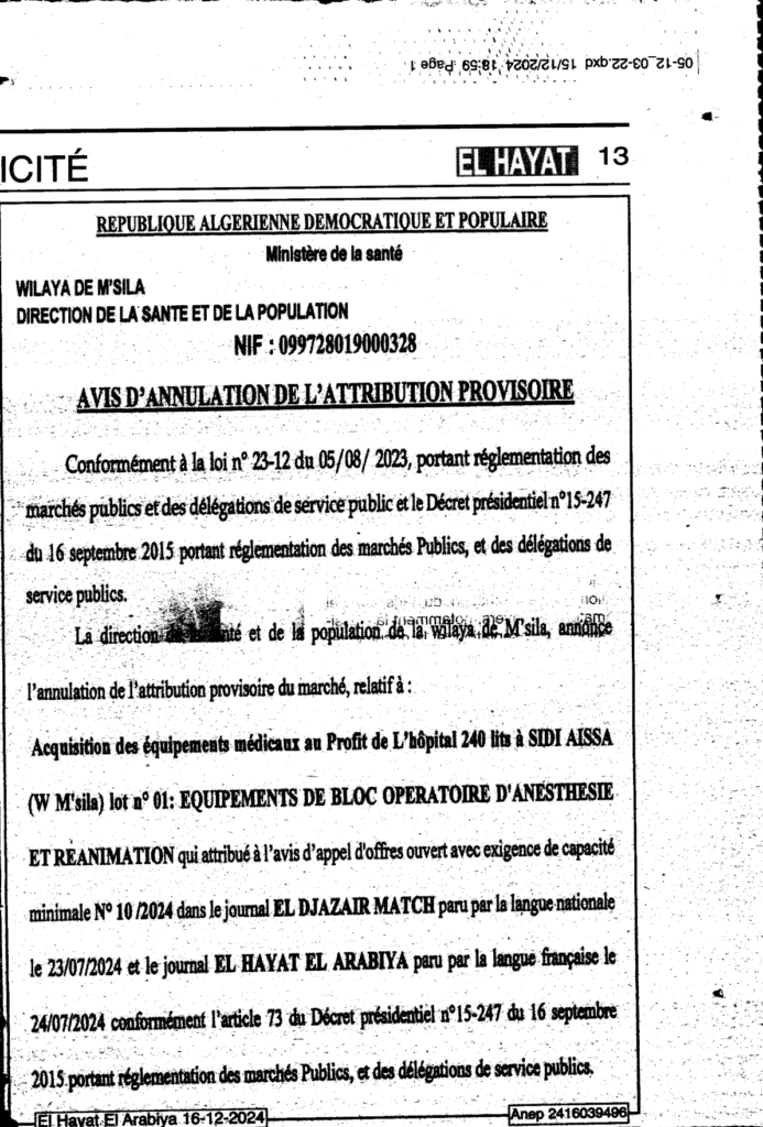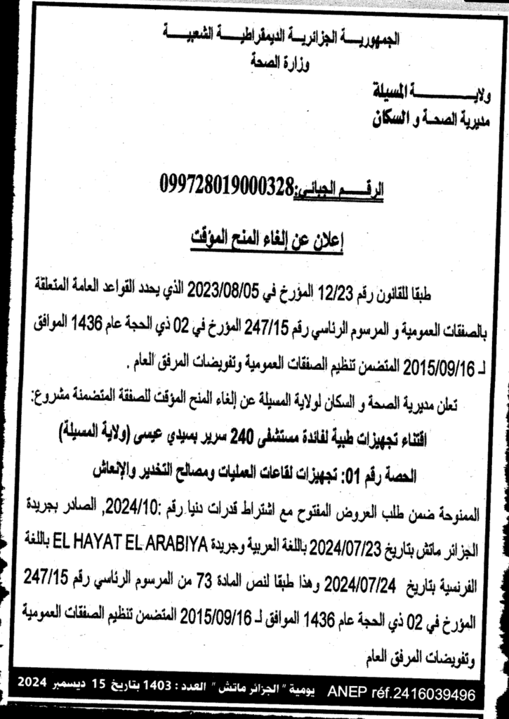 إعلان عن إلغاء المنح المؤقت لاقتناء تجهيزات طبية لفائدة مستشفى 240 سرير بسيدي عيسى/ مديرية الصحة والسكان لولاية المسيلة