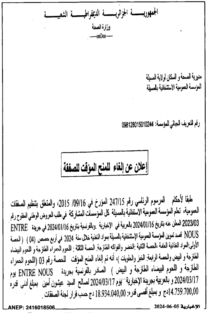 إعلان عن إلغاء المنح المؤقت للصفقة/ المؤسسة العمومية الاستشفائية بالمسيلة
