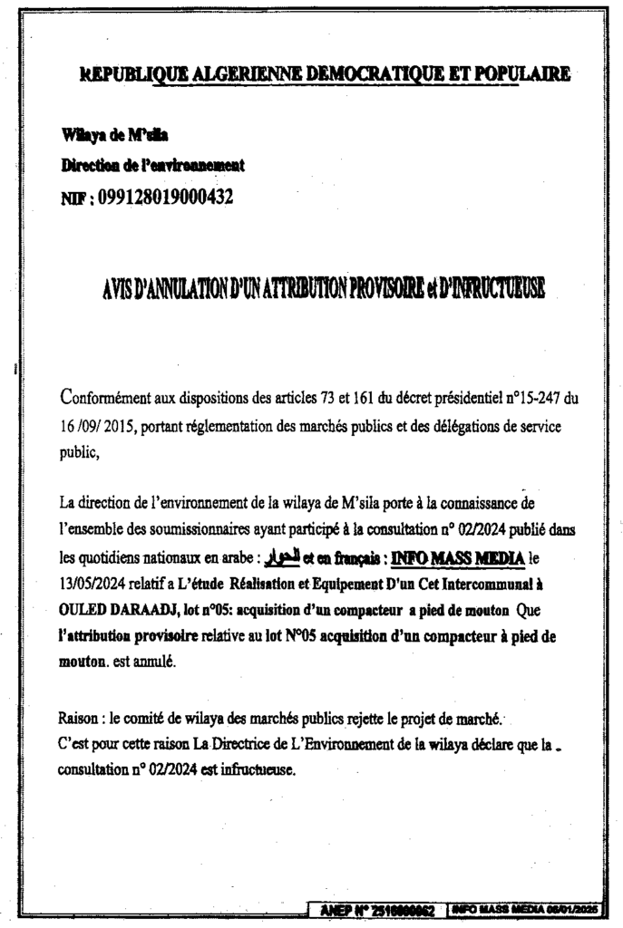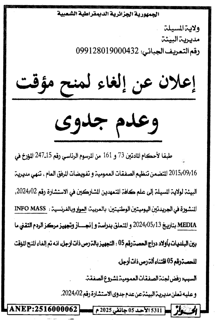 إعلان عن إلغاء المنح المؤقت وعدم جدوى/ مديرية البيئة لولاية المسيلة