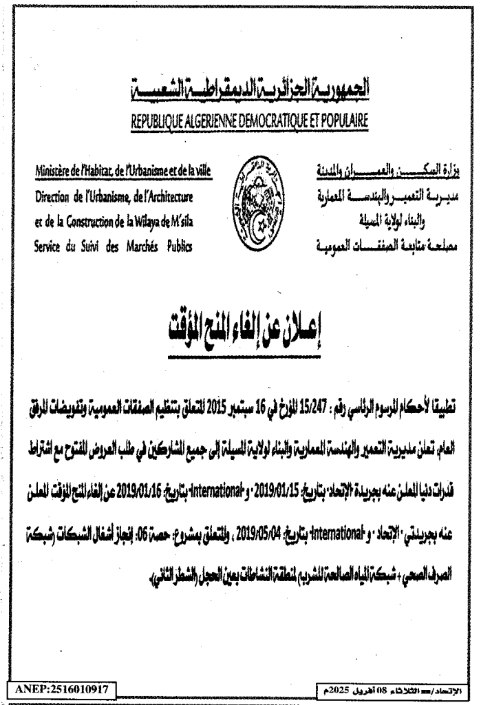 إعلان عن إلغاء المنح المؤقت/ مديرية التعمير والهندسة المعمارية والبناء لولاية المسيلة