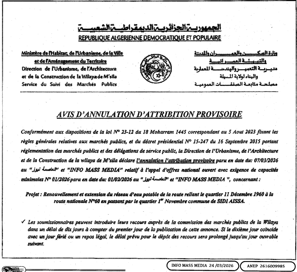 إعلان عن إلغاء المنح المؤقت/ مديرية التعمير والهندسة المعمارية والبناء لولاية المسيلة