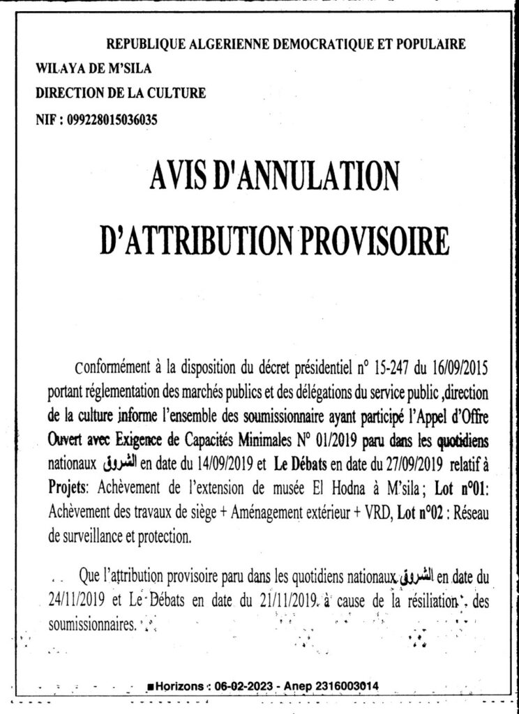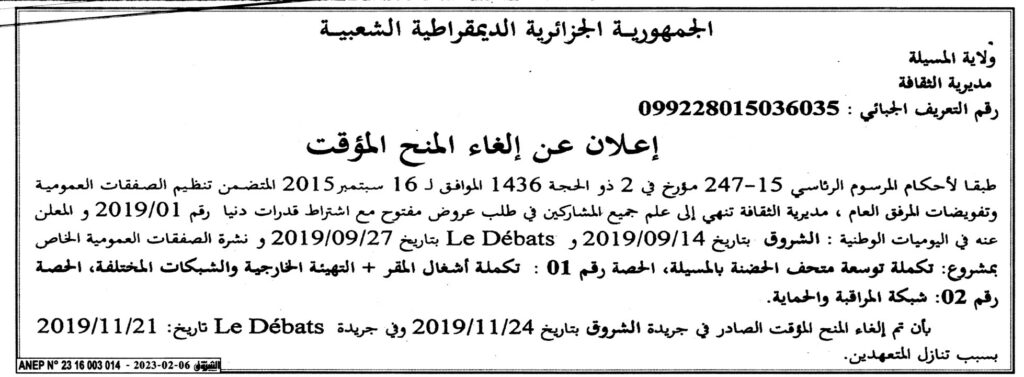 إعلان عن إلغاء المنح المؤقت/ مديرية الثقافة لولاية المسيلة