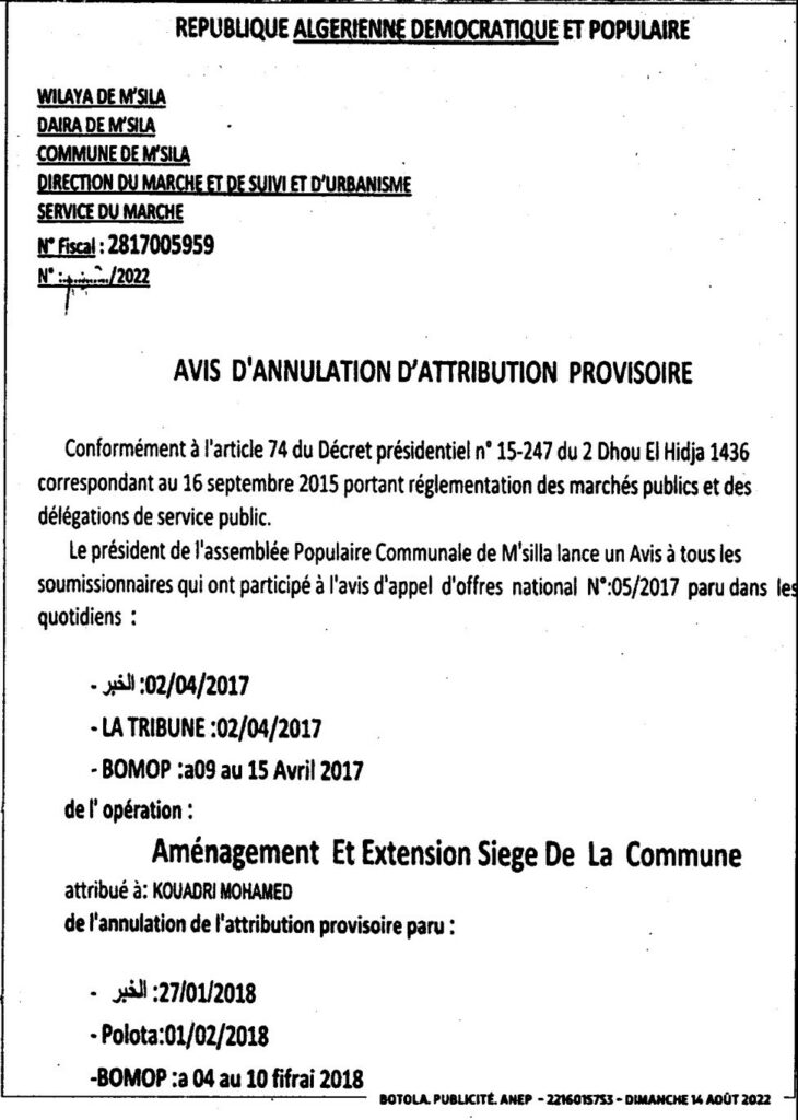 تقرر إلغاء المنح المؤقت للمشروع التالي: تهيئة وتوسيع مقر البلدية14 أغسطس، 20220 79 شاركها فيسبوك X مشاركة عبر البريد طباعة