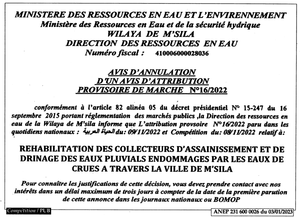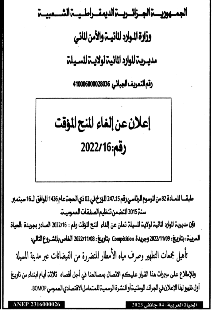 إعلان عن إلغاء المنح المؤقت 2022/16 مديرية الموارد المائية لولاية المسيلة