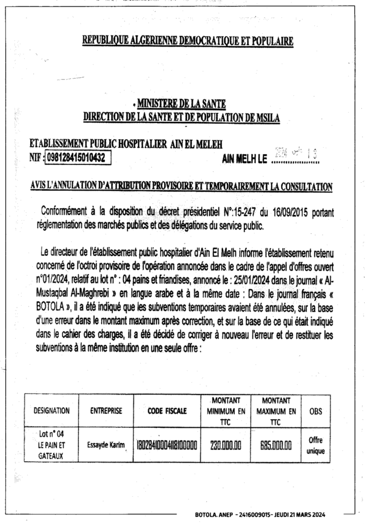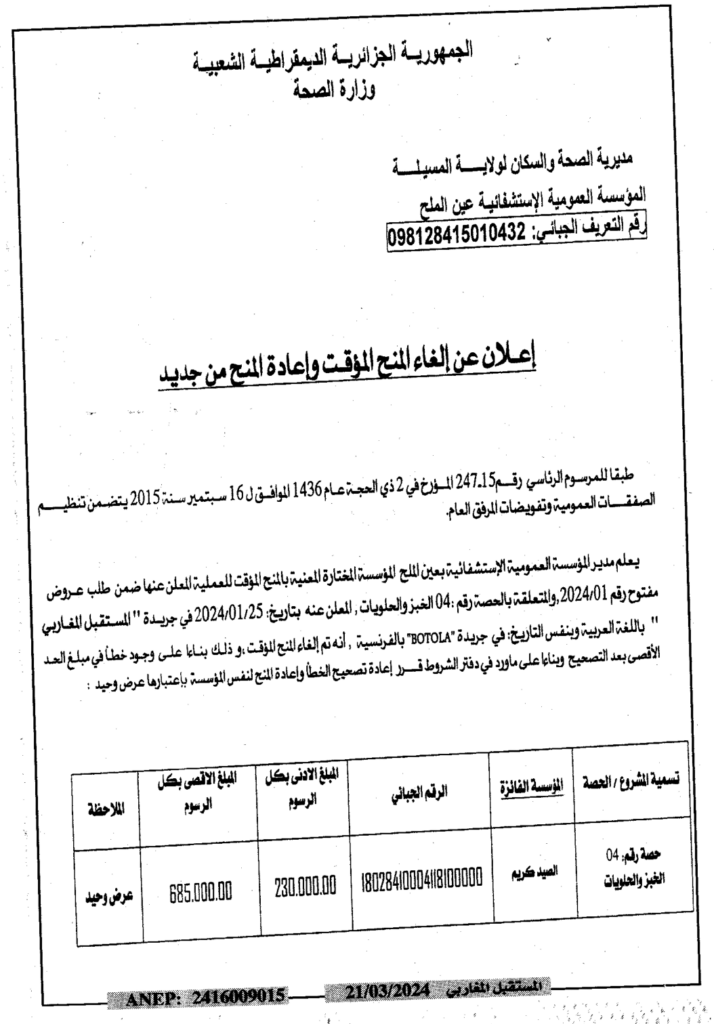 إعلان عن إلغاء المنح المؤقت وإعادة المنح من جديد/ المؤسسة العمومية الاستشفائية عين الملح