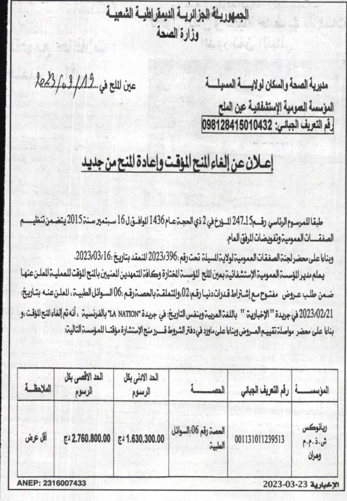 إعلان عن إلغاء المنح المؤقت وإعادة المنح من جديد/ المؤسسة العمومية الاستشفائية عين الملح
