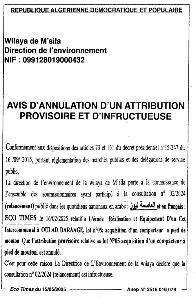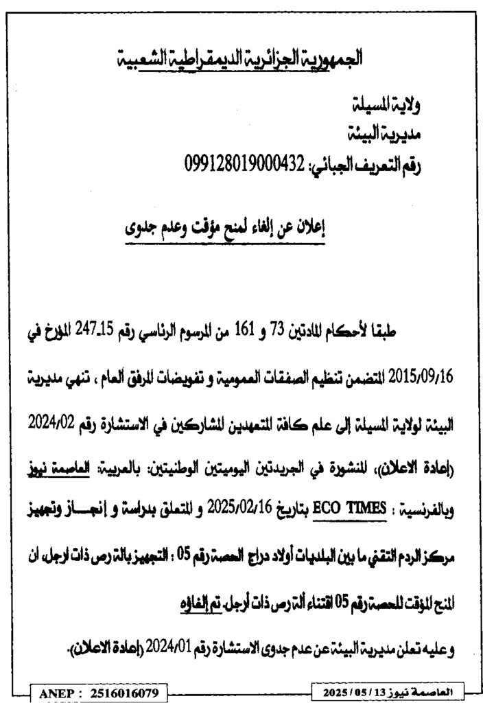 إعلان عن إلغاء المنح المؤقت وعدم جدوى لدراسة وانجاز وتجهيز مركز الردم التقنيما بين البلديات أولاد دراج/ مديرية البيئة لولاية المسيلة