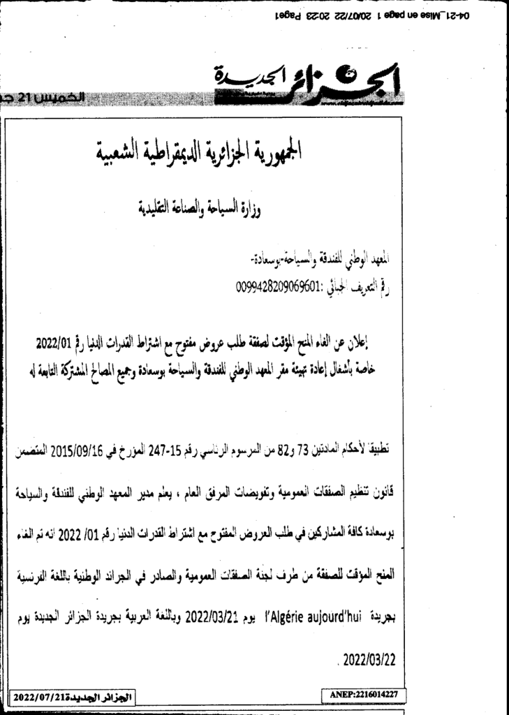 إعلان عن إلغاء المنح مؤقت خاصة بأشغال إعادة تهيئة مقر المعهد الوطني للفندقة والسياحة بوسعادة