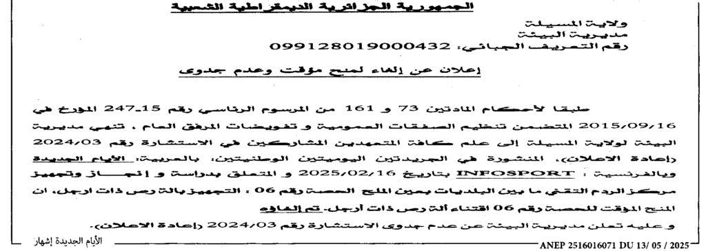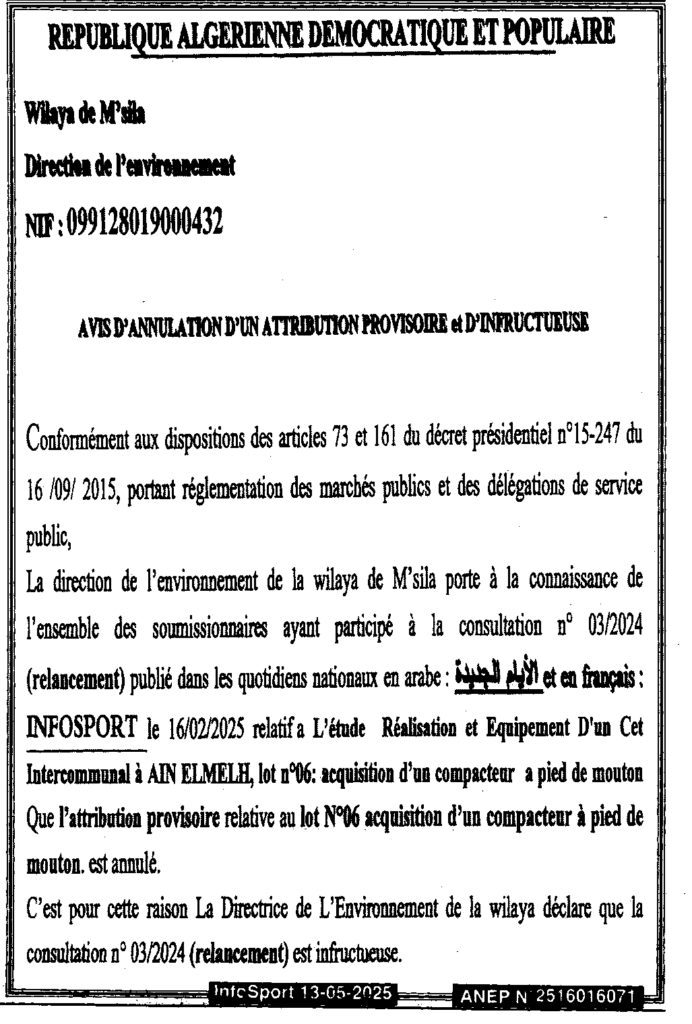 إعلان عن إلغاء لمنح مؤقت وعدم جدوى لدراسة وانجاز وتجهيز مركز الردم التقني ما بين البلديات بعين الملح/ مديرية البيئة لولاية المسيلة
