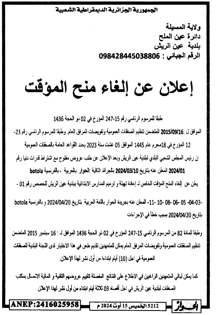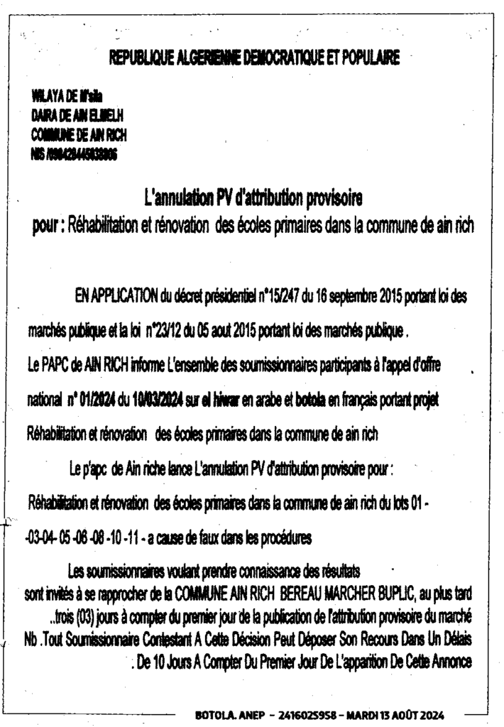 إعلان عن إلغاء منح المؤقت إعادة تهيئة وترميم المدارس الابتدائية ببلدية عين الريش
